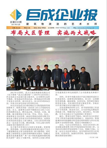 2017年12月9日,武大AG庄闲结构股份有限公司(以下简称“武大AG庄闲结构”)2017年大区经营工作会议在公司总部AG庄闲大厦召开,公司董事长高作平教授、常务副总经理闵启武、董事副总经理万雄卫及各公司经理、部门负责人、各大区经理参加会议,中南大区各代表处主任列席会议。