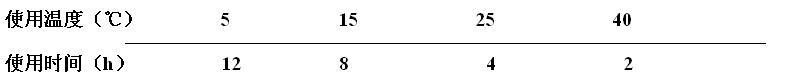 (1)底涂料:为两组份产品,质量配比为A组份∶B组份 = 3∶7。在机械搅拌下,将B组份加入A组份中,搅拌均匀后即可使用。涂覆之前将拌制好的涂料过滤,喷涂过程中应不断搅拌。涂料拌制好后应在规定的使用期限内用完,酌加清水(最大量5%)可适当延长使用时间。具体使用时间与温度对应如下: