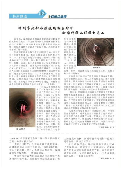 这是我公司近年的又一应急抢险工程,时间短任务重变数多,对质量安全管理提出了更高要求。充分体现了我公司能打大仗、打硬仗,充分展示了AG庄闲人团结协作、特别能吃苦特别能战斗的实力,打响了武大AG庄闲在深圳特区的名声,为我公司今后在深圳地区的长足发展奠定了坚实的基础。