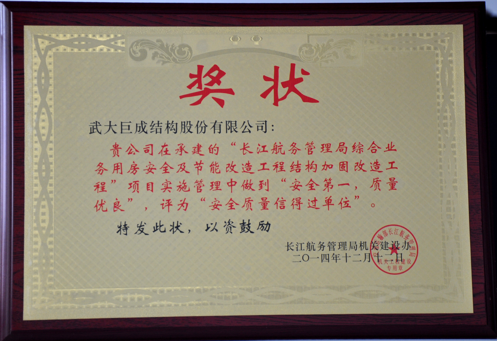 2014年12月12日,长江航务管理局授予我公司“安全质量信得过单位”荣誉证书。